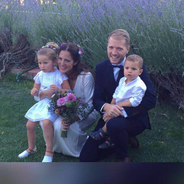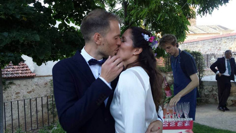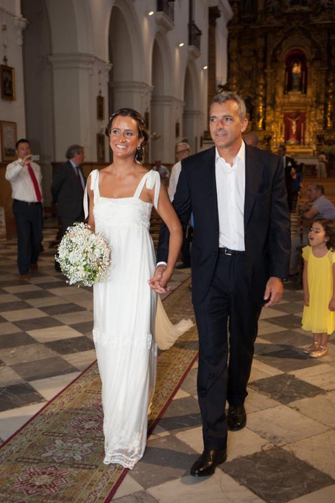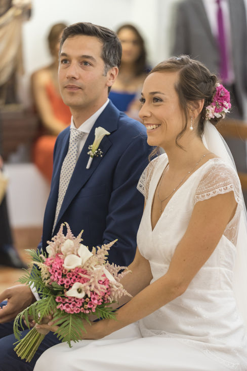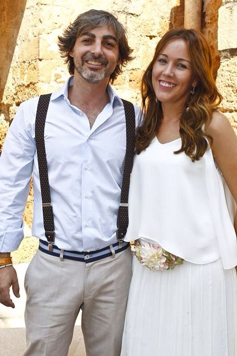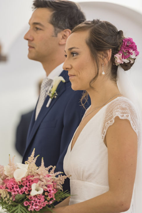 Marta: Eligió dos coronas para su gran día: una más atrevida y salvaje para la preboda, con flores y plumas, y otra más romántica para la ceremonia, con pequeñas rosas en tonos nude, ambas de ráfia natural.