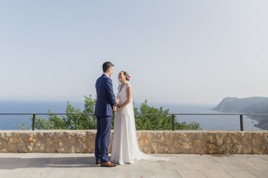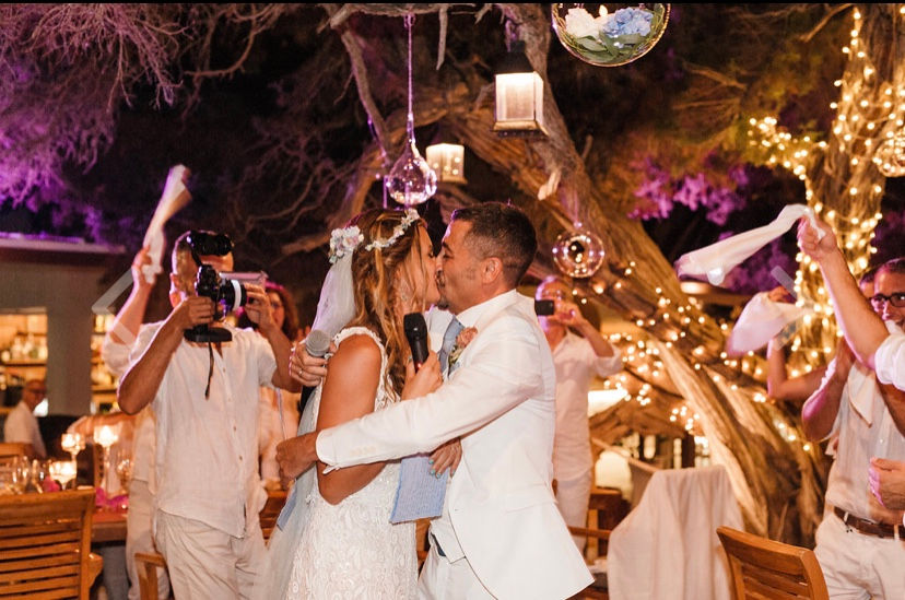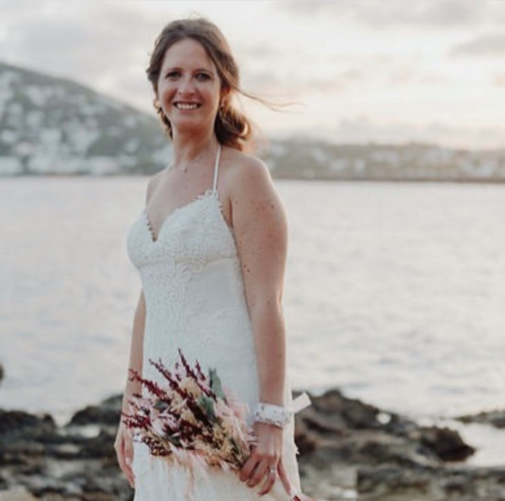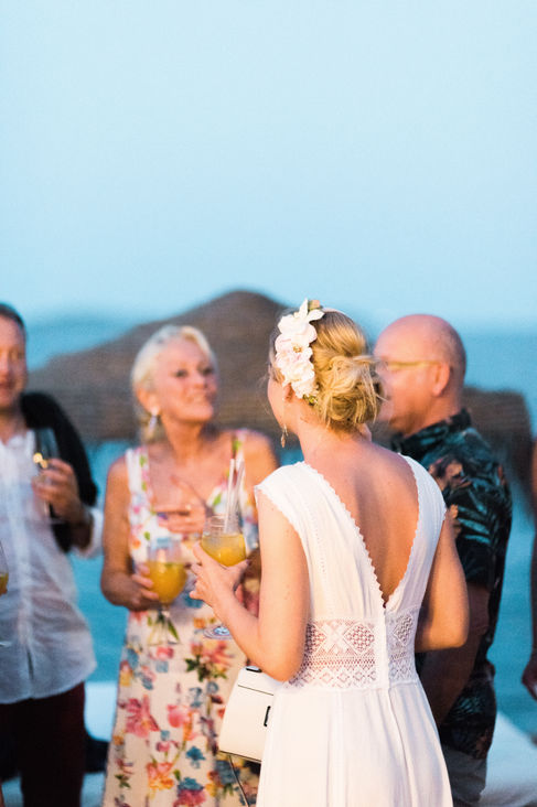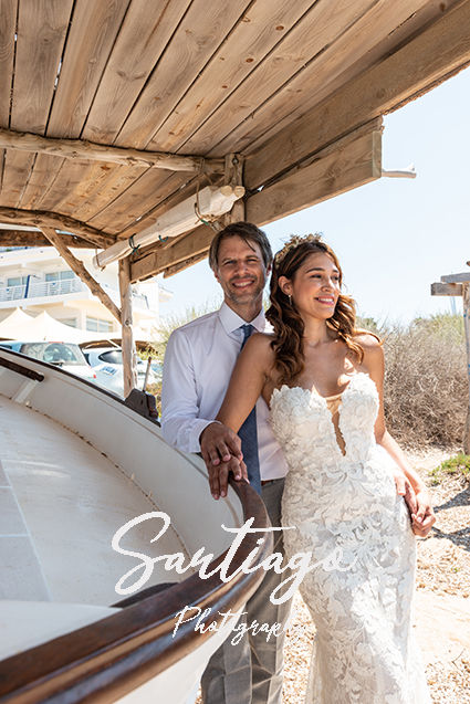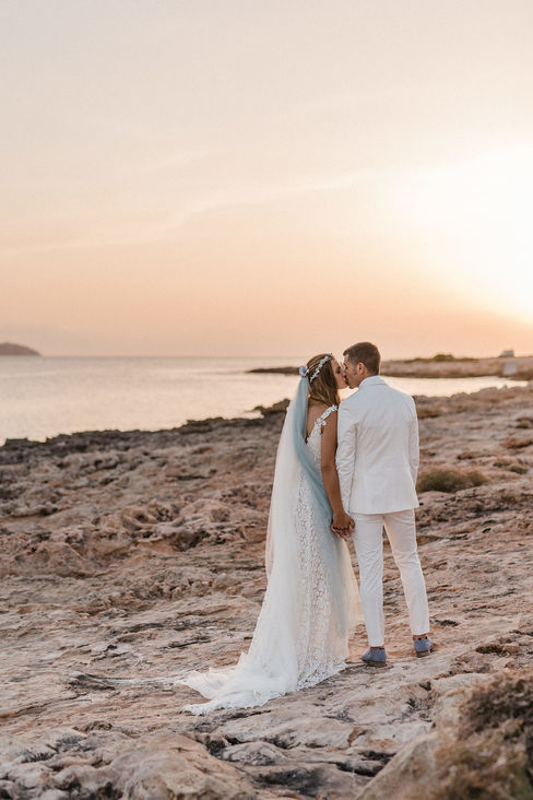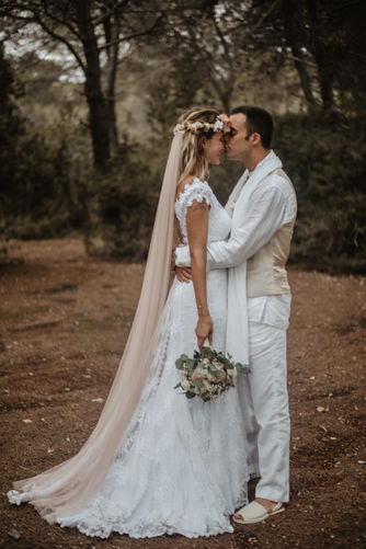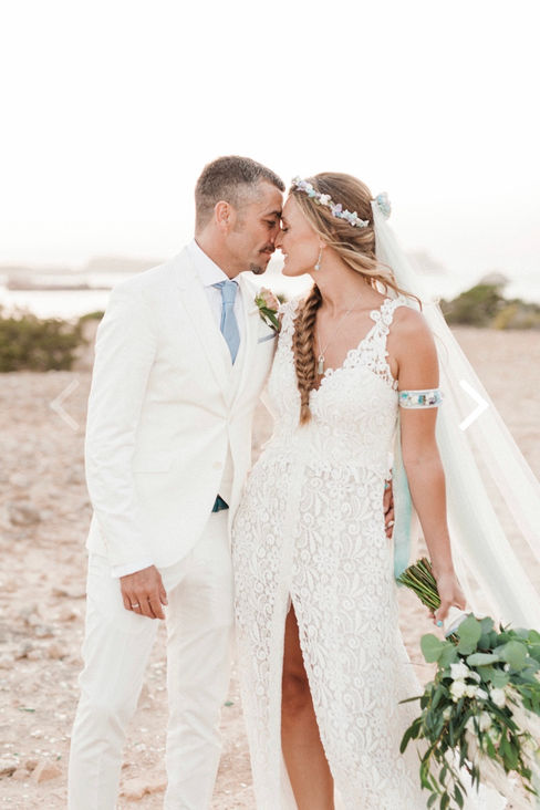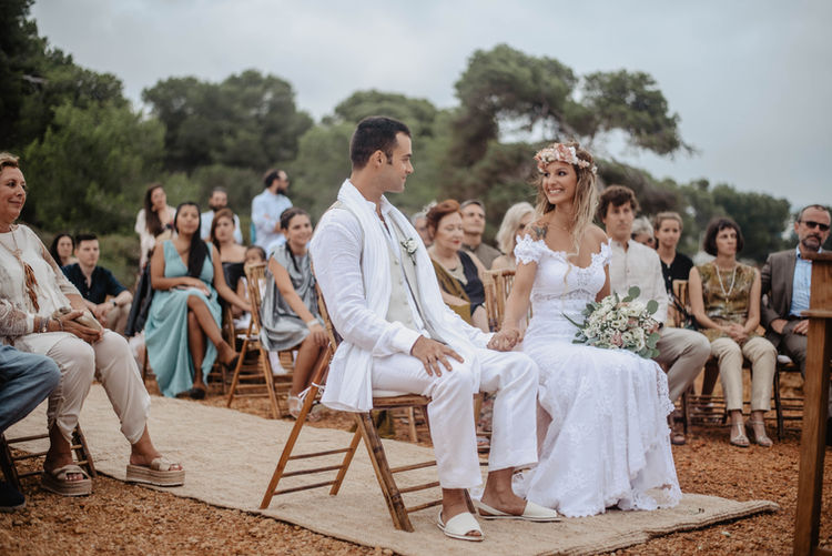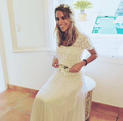 Magda: Una novia con total look BelénBoheme para una boda íntima en Formentera: vestido de crepe con puntillas vintage, corona de florecitas, alpargatas y tocado de flores.
