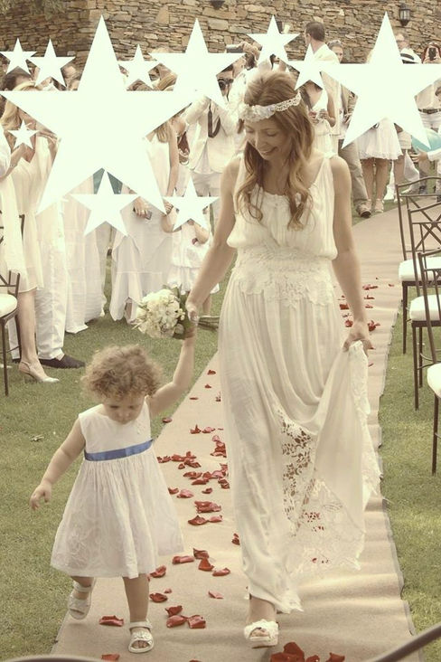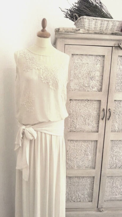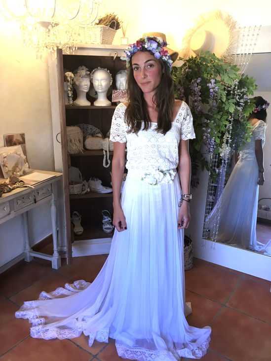Abi: Total look BelénBoheme con vestido de crepe y guipur, alpargatas y tocado a juego.