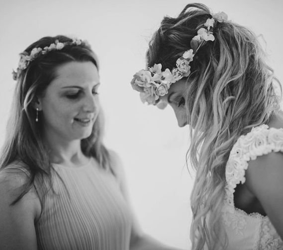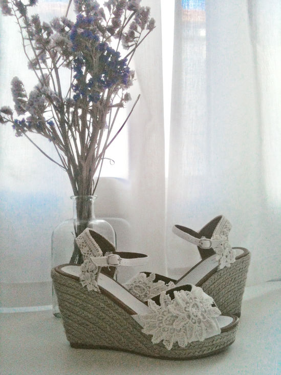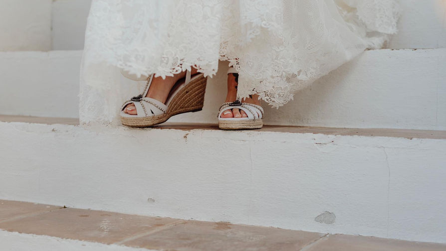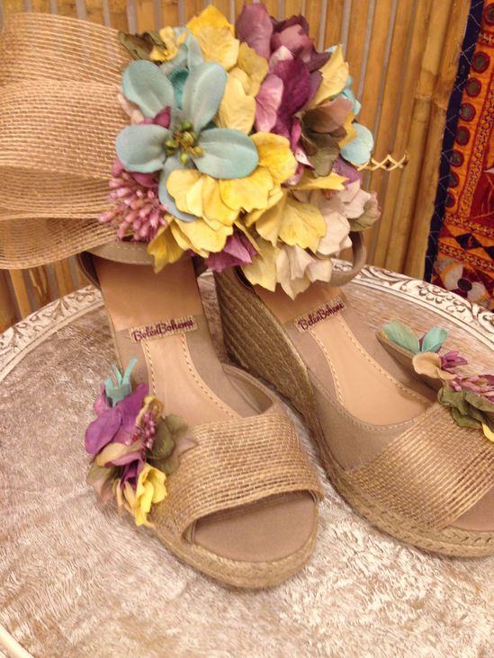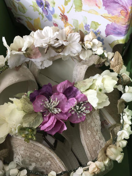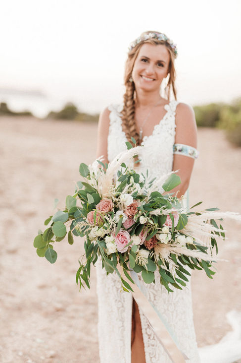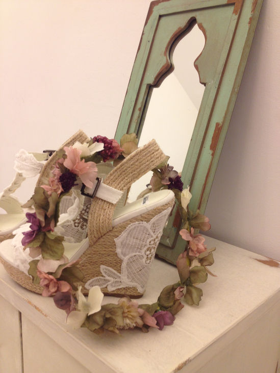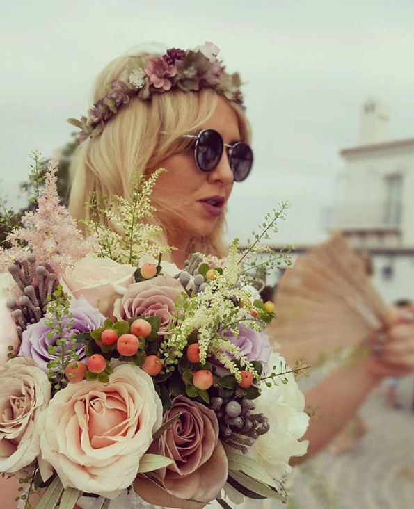 Haley: Corona de flores en tonos apagados a juego con el ramo y alpargatas.