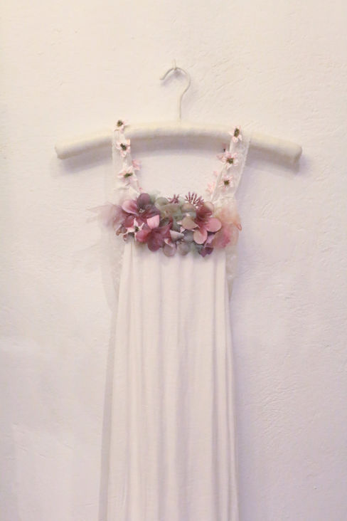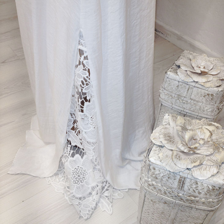 Paula: Vestido lencero de tul de seda, puntillas y bordados.
