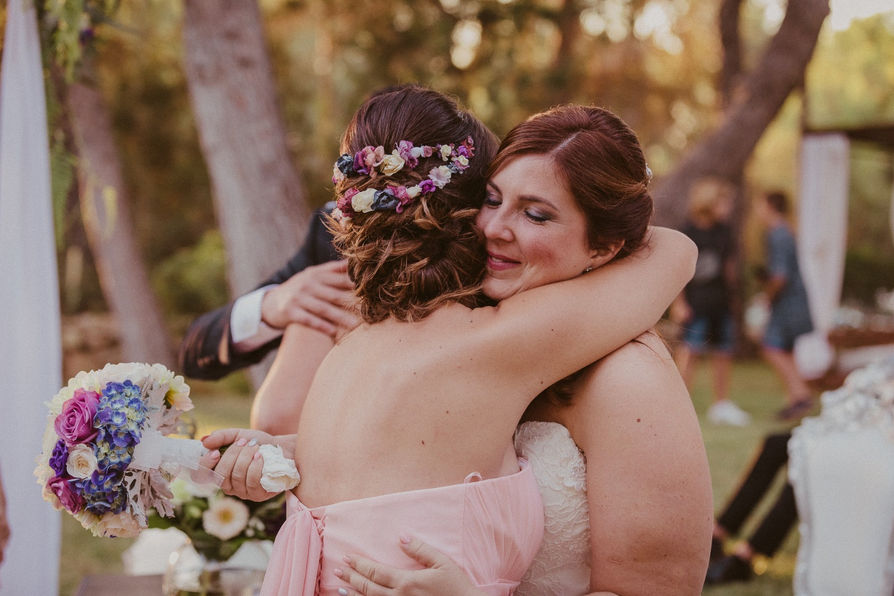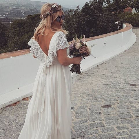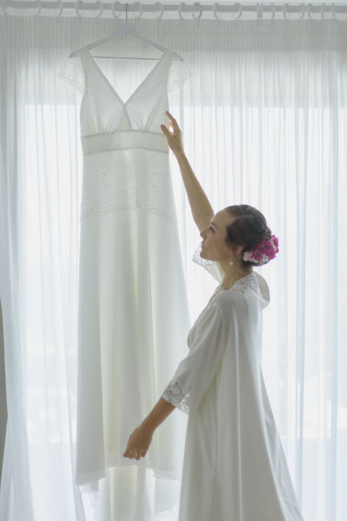 Monica: Total look BelénBoheme con vestido de crepe Silvestre, con espalda cruzada de puntillas y flores.