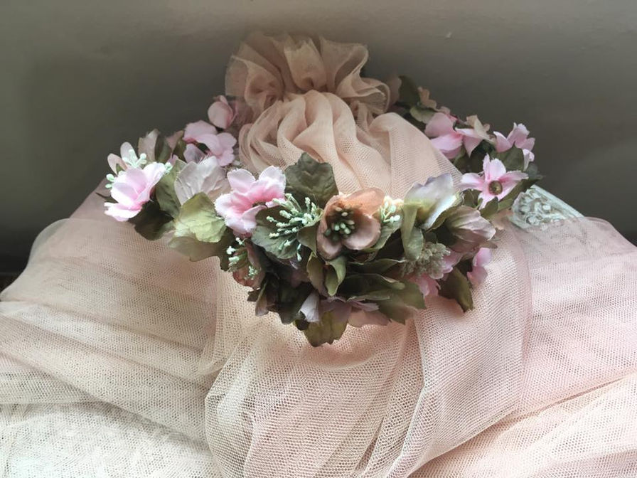 Carla: Corona de flores con velo de tul de gasa rosa empolvado, y sus damas de honor con coronitas a juego.