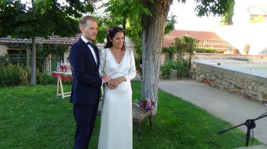 Esther: Una novia con total look BelénBoheme, en una boda íntima celebrada en el jardín de su casa. Vestido de crepe con flores bordadas y escote a la espalda, cinturón de gasa y flores, alpargatas y tocadito lateral.